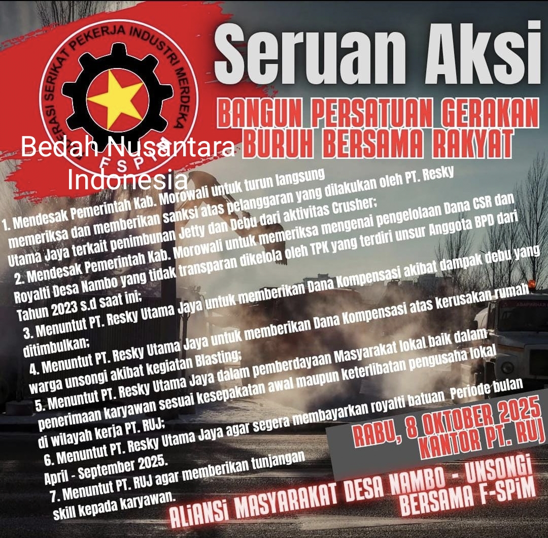 Morowali- Aliansi Masyarakat Desa Nambo–Unsongi berencana melakukan aksi unjuk rasa (Unras) di lokasi PT. Risky Utama Jaya (PT. RUJ), Desa Nambo, Kecamatan Bungku Timur, Kabupaten Morowali.