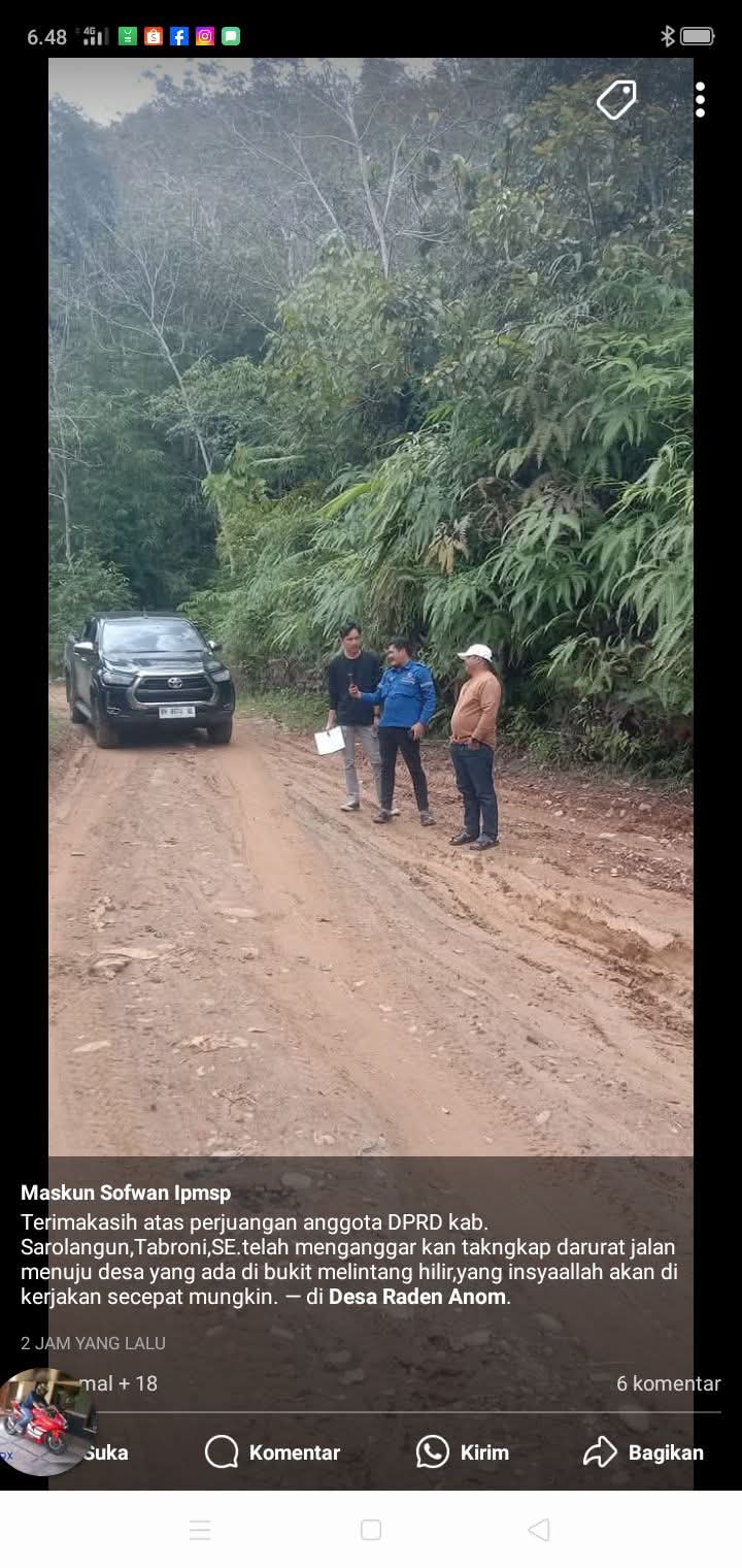 Sarolangun, bedahnusantaraindonesia.id- Terkait pemberitaan Ambruk gorong- gorong jalan bukit malintang di desa Raden Anom kecamatan batang asai DPRD kabupaten sarolangun beberapa waktu lalu yang kemudian Viral di media sosial( Medsos) dengan keperihatinan DPRD langsung turun kelokasi pada sabtu tanggal 26 januari 2025 anggota DPRD yang turun tersebut Tabroni dan bersama anggota DPRD lainnya.