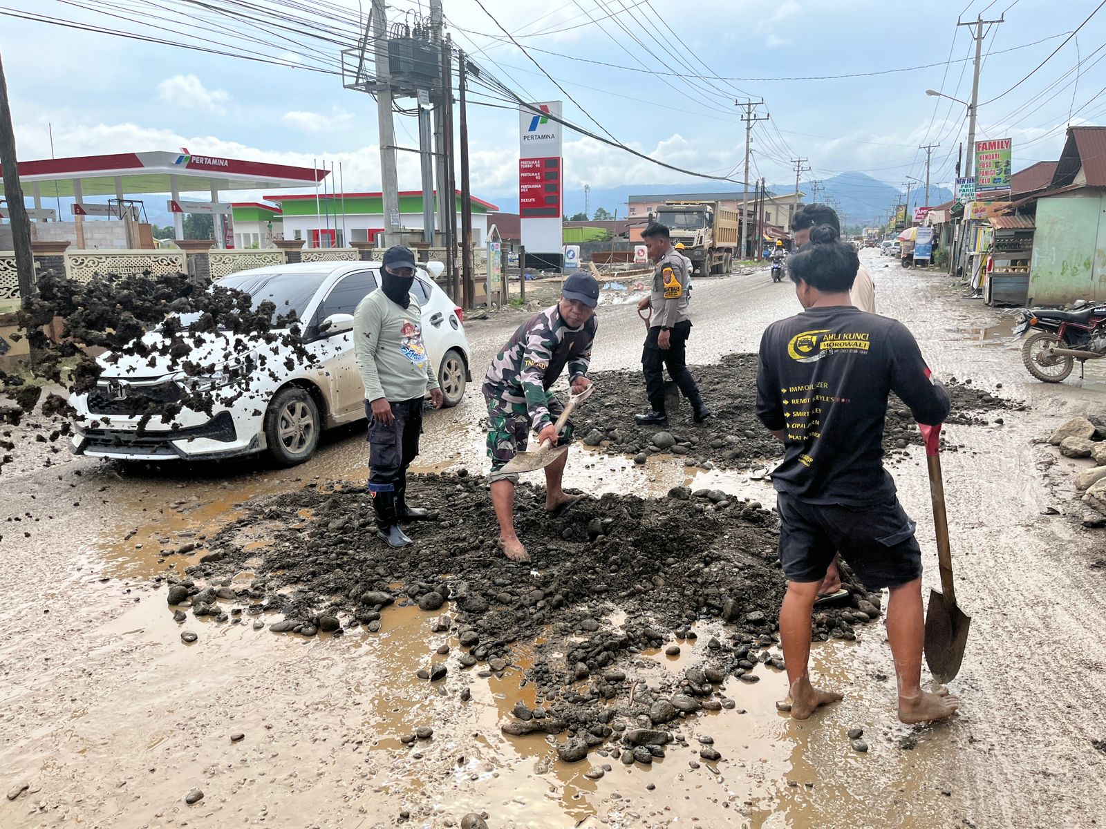 Morowali, Sulawesi Tengah–– Babinsa Koramil 1311-09/Bahodopi, Sertu Marhadi, bersama Bhabinkamtibmas Polsek Bahodopi dan masyarakat setempat melaksanakan kegiatan penimbunan jalan rusak di ruas Jalan Trans Sulawesi, tepatnya di Desa Bahodopi, Kecamatan Bahodopi, Kabupaten Morowali, pada Kamis (27/11/2025).