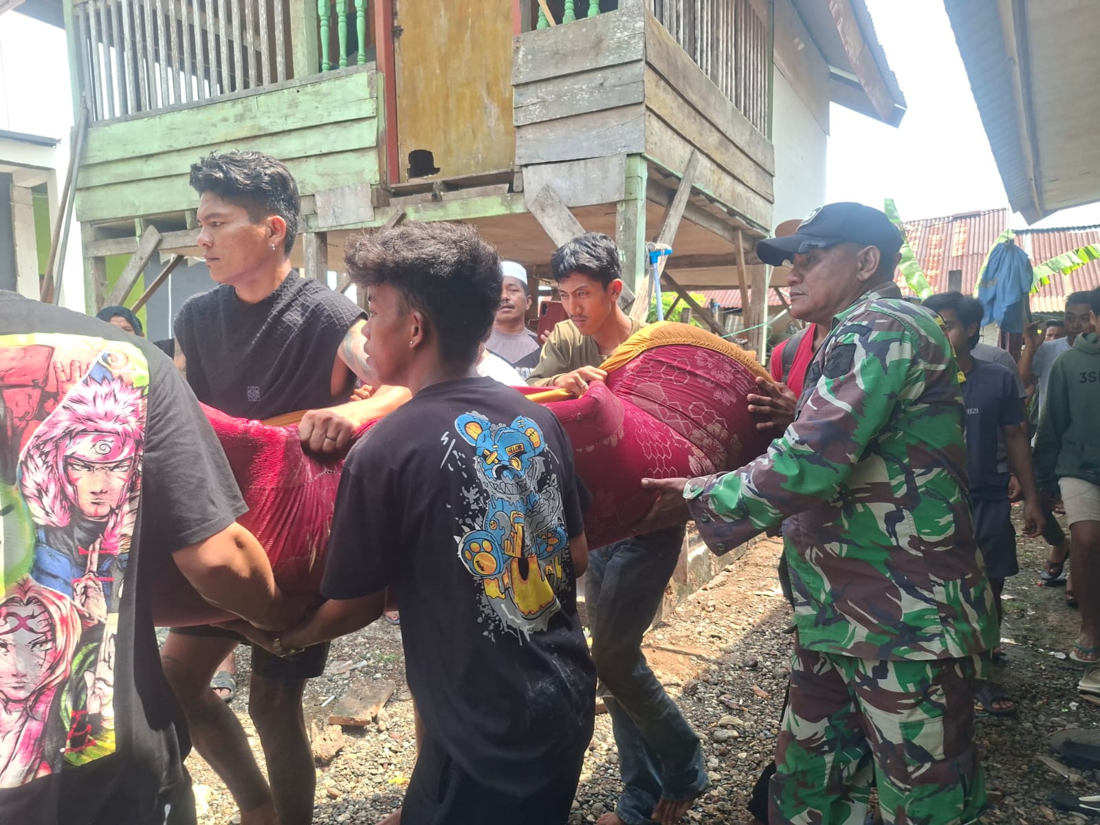 Morowali, Sulawesi Tengah— Babinsa Koramil 1311-09/Bahodopi Pelda Aris Prayogo membantu warga mengevakuasi seorang warga yang ditemukan meninggal dunia di dalam kamar kost di Desa Bete-bete, Kecamatan Bahodopi, Kabupaten Morowali, Minggu (19/04/2026).