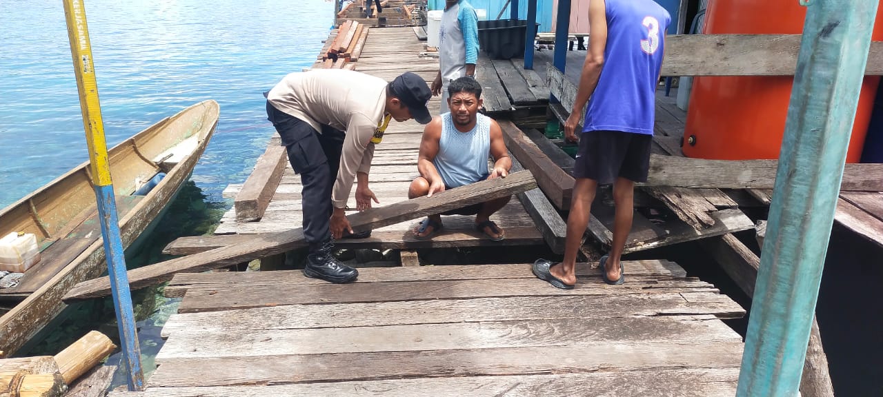Morowali- Kepedulian Polri terhadap masyarakat kembali ditunjukkan Bhabinkamtibmas Desa Mbokita, Brigpol Mujahidin Diar, dari Subsektor Menui Kepulauan Polres Morowali. Ia ikut bergotong royong bersama warga memperbaiki jalan kayu rusak di Desa Mbokita, Kecamatan Sombori Kepulauan.(17/9/25)
