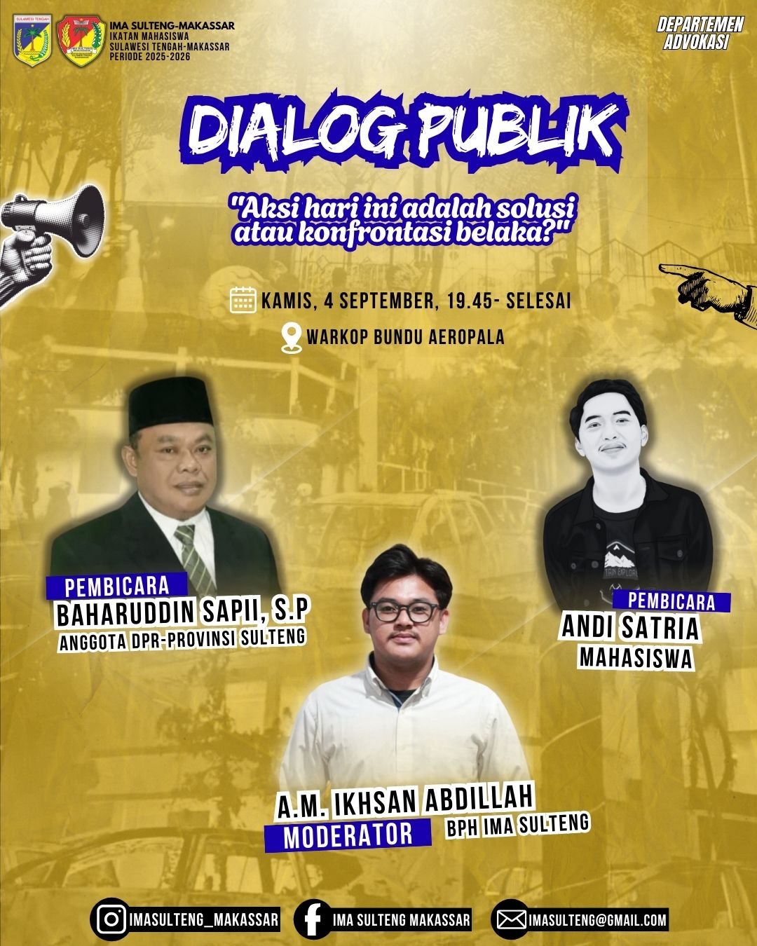 Makassar- Merebaknya kericuhan dalam sejumlah demonstrasi terakhir menjadi sorotan dalam dialog publik yang digelar Ikatan Mahasiswa Sulawesi Tengah-Makassar (IMA Sulteng-Makassar). Acara yang berlangsung di Makassar ini bertujuan mencari jalan tengah agar penyampaian aspirasi tidak lagi berujung konfrontasi, melainkan menghasilkan solusi nyata.(5/9/25)