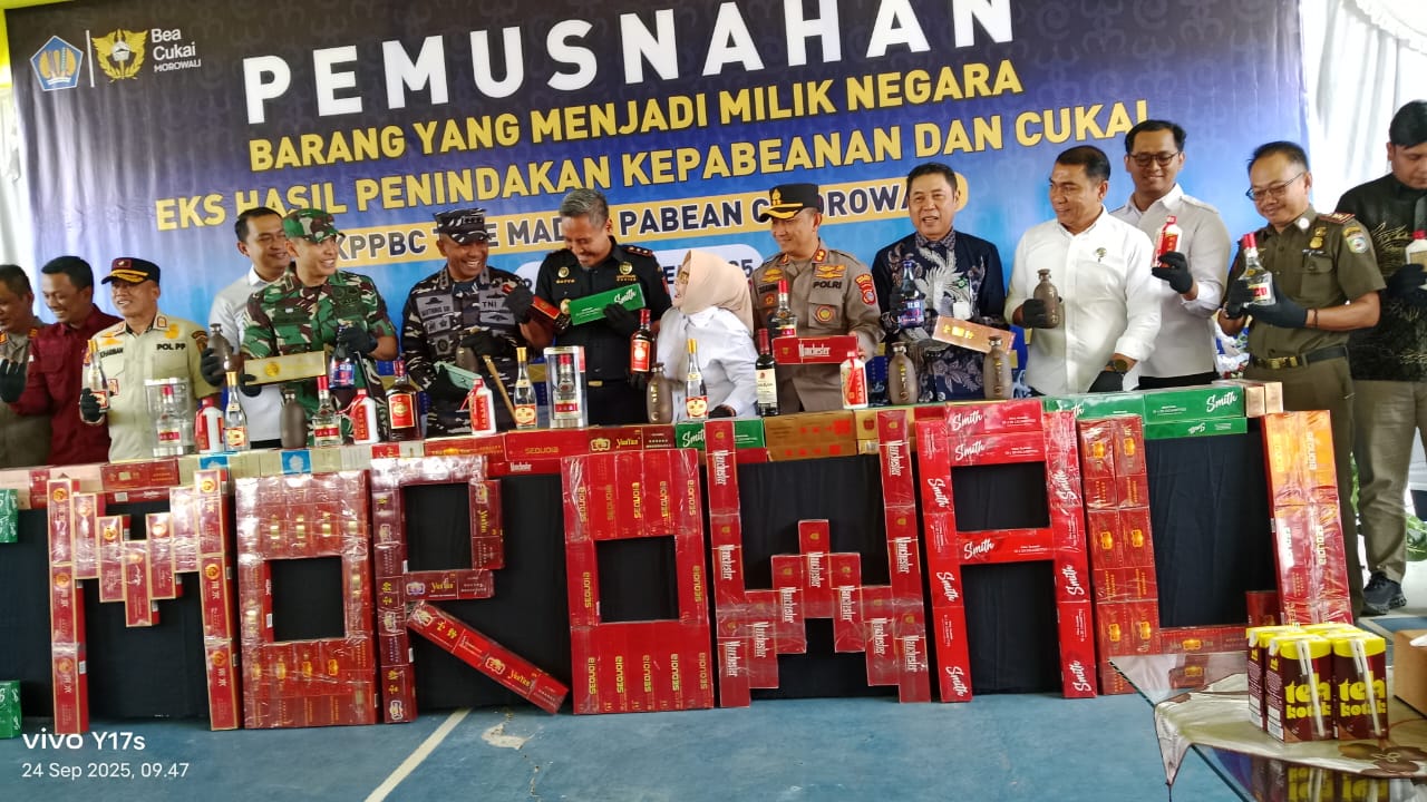 Morowali- Bea Cukai Morowali kembali melaksanakan pemusnahan barang hasil penindakan. Bertempat di halaman Kantor Bea Cukai Morowali, Rabu (24/09/2025) sebanyak 1.461.444 batang rokok ilegal dan 1.311,08 liter minuman beralkohol ilegal resmi dimusnahkan.