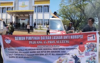 Morowali, Sulawesi Tengah — Sejumlah massa yang tergabung dalam Laskar Anti Korupsi Pejuang 45 bersama masyarakat Desa Nambo menggelar aksi demonstrasi di Kejaksaan Negeri Morowali, Selasa (14/04/2026).