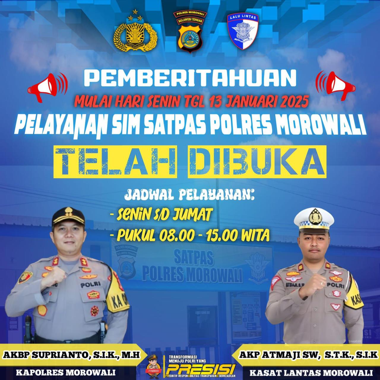 Kasat Lantas Polres Morowali, AKP Atmaji Sugeng Wibowo, S.T.K., S.I.K., menambahkan bahwa layanan ini beroperasi setiap hari kerja, yakni Senin hingga Jumat, mulai pukul 08.00 hingga 15.00 WITA. Pelaksanaan pembuatan dan perpanjangan SIM dilakukan sesuai dengan Standar Operasional Prosedur (SOP).