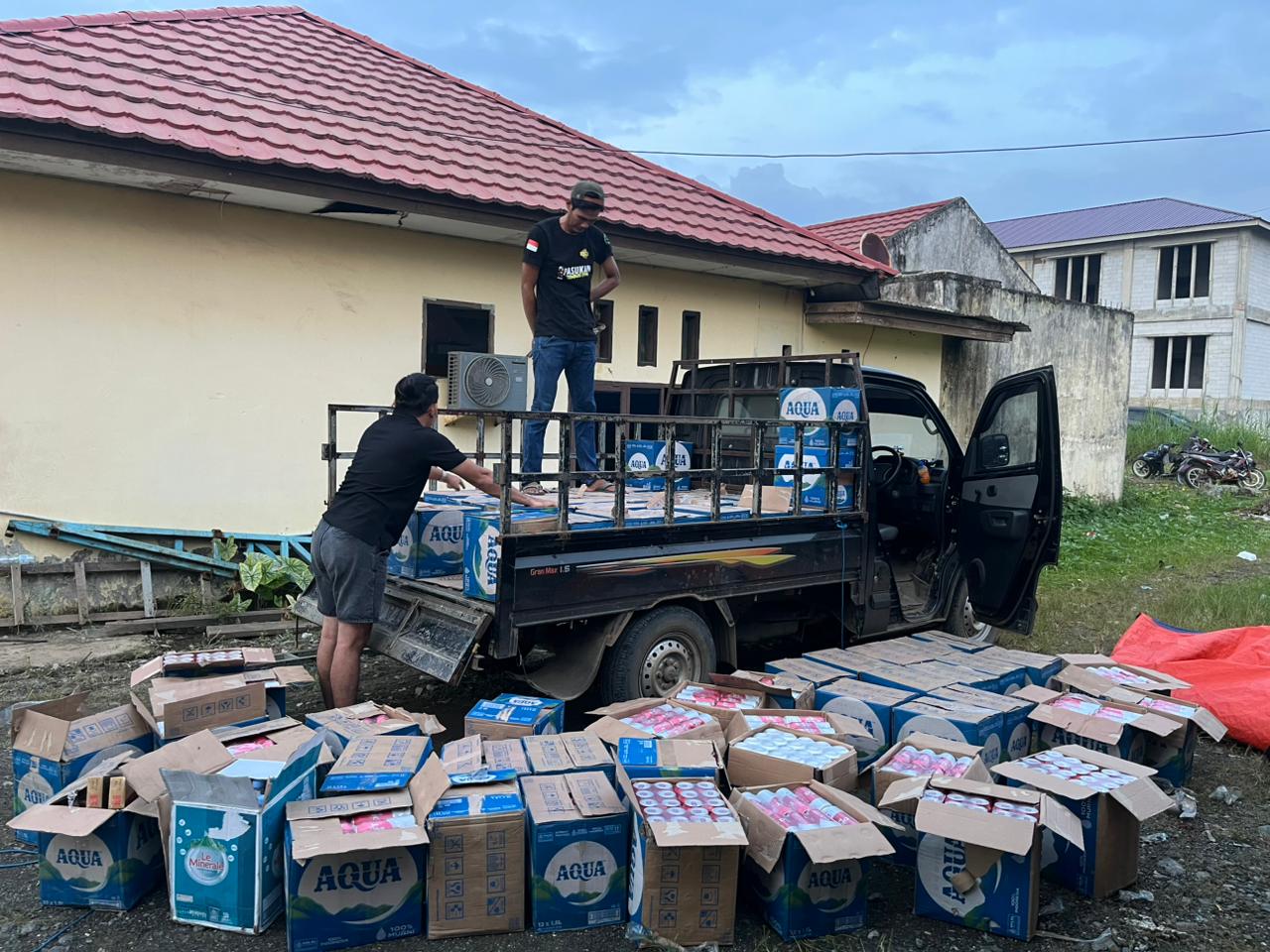 Barang bukti yang disita antara lain satu unit mobil pick up, puluhan dus minuman beralkohol jenis bir, minuman oplosan, serta rokok ilegal tanpa pita cukai.