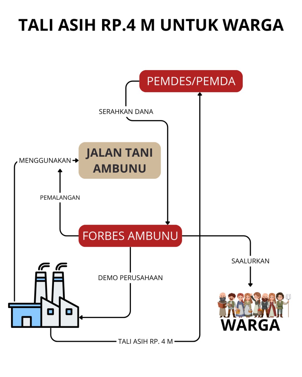 Dana Rp 4 miliar kemudian diserahkan oleh perusahaan, tidak melalui mekanisme retribusi resmi, tetapi dalam bentuk tali asih. Alur yang tergambar menunjukkan bahwa dana tersebut diberikan melalui Pemdes/Pemda, sebelum akhirnya mengalir ke Forbes Ambunu, kelompok masyarakat yang menjadi aktor utama dalam aksi pemalangan dan demonstrasi.