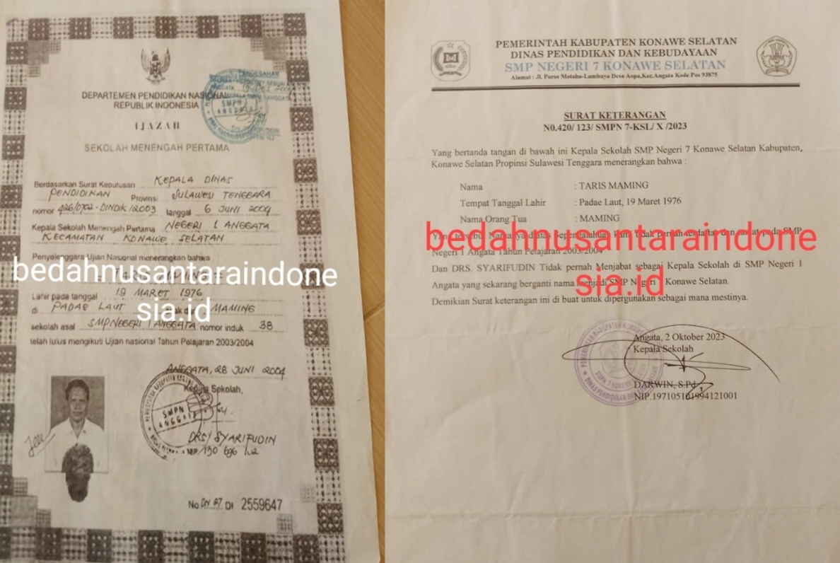 Dugaan ini diperkuat oleh surat keterangan resmi dari Kepala Sekolah SMP Negeri 7 Konawe Selatan, Darwin, S.Pd. Dalam surat bernomor 420/123/SMPN7-KSL/X2023 tertanggal 2 Oktober 2023, Darwin menyatakan bahwa Taris Maming tidak pernah terdaftar maupun tamat dari SMP Negeri 1 Angata (sekarang SMP Negeri 7 Konawe Selatan) pada tahun pelajaran tersebut. Lebih lanjut, nama Drs. Syarifuddin, yang tercantum dalam ijazah sebagai kepala sekolah, juga dinyatakan tidak pernah menjabat di sekolah tersebut.