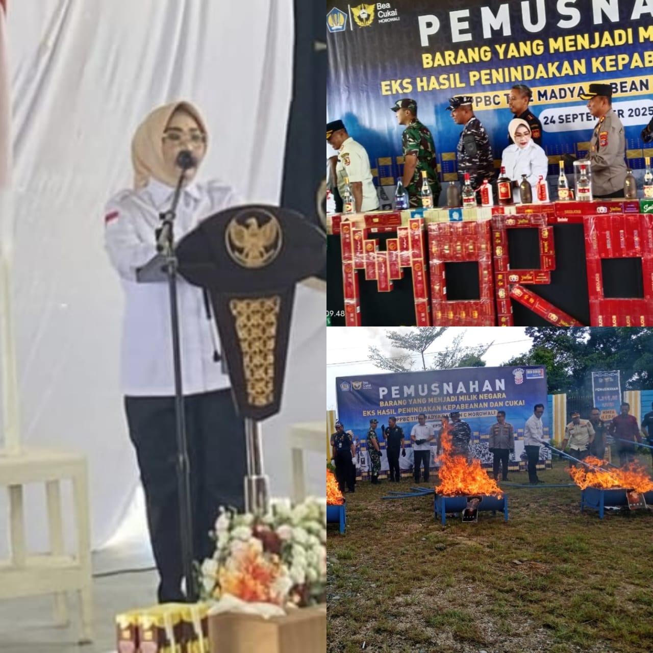 Morowali- Wakil Bupati Morowali, Iriane Ilyas, menegaskan bahwa kegiatan pemusnahan jutaan batang rokok dan ribuan liter minuman beralkohol ilegal yang digelar di halaman Kantor Bea Cukai Morowali bukan hanya sekadar seremoni belaka, melainkan wujud nyata komitmen bersama dalam menjaga keamanan dan ketertiban di Kabupaten Morowali.